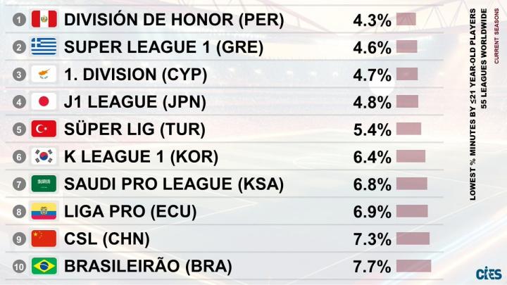 U21球员出场时间占比最少的10个联赛:一场“年轻球员排斥大赛”